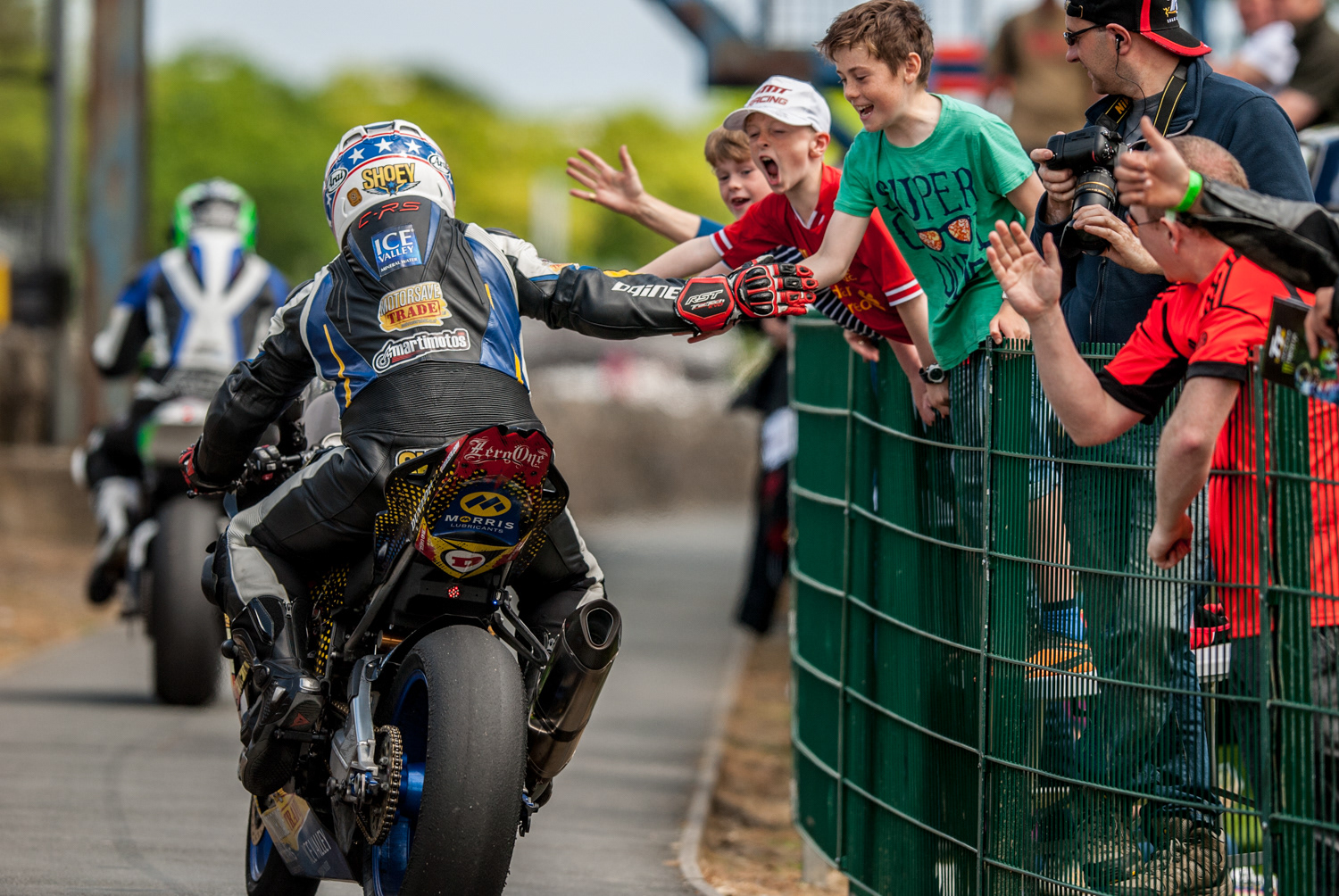 I was stood in the return lane during the Superbike TT 2014 when I heard some cheering from further up the road. I headed up to see what the noise was and spotted these young lads trying to get high 5's as the riders were coming back in after the race. They were so happy when Paul Shoesmith obliged and put his hand out. This is what is unique about the Isle of Man TT, you can get so close to your heroes, you can literally reach out and touch them!
