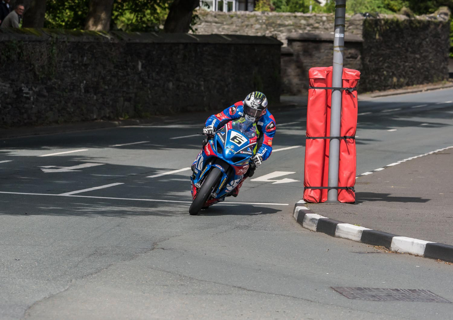 This is Michael Dunlop aiming for a patch of tarmac about a metre to the left of me. I am shooting over the top of a crash barrier around a traffic light signal. Michael is travelling at over 160mph, taking the line that just misses the crash barrier covered traffic light in the shot. It has to be one of the scariest places I have ever photographed from. I have prefocused this shot because even with a fast shutter speed and a fast lens, it's virtually impossible to track focus this shot. Nikon D810, Nikon 200mm f2 lens, 1/4000sec, f7.1, ISO500. Developed in Lightroom.